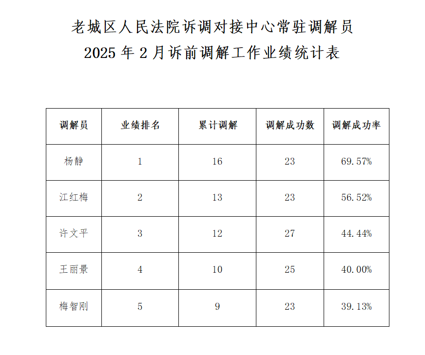 老城区人民法院诉调对接中心常驻调解员2025年2月诉前调解工作业绩统计表