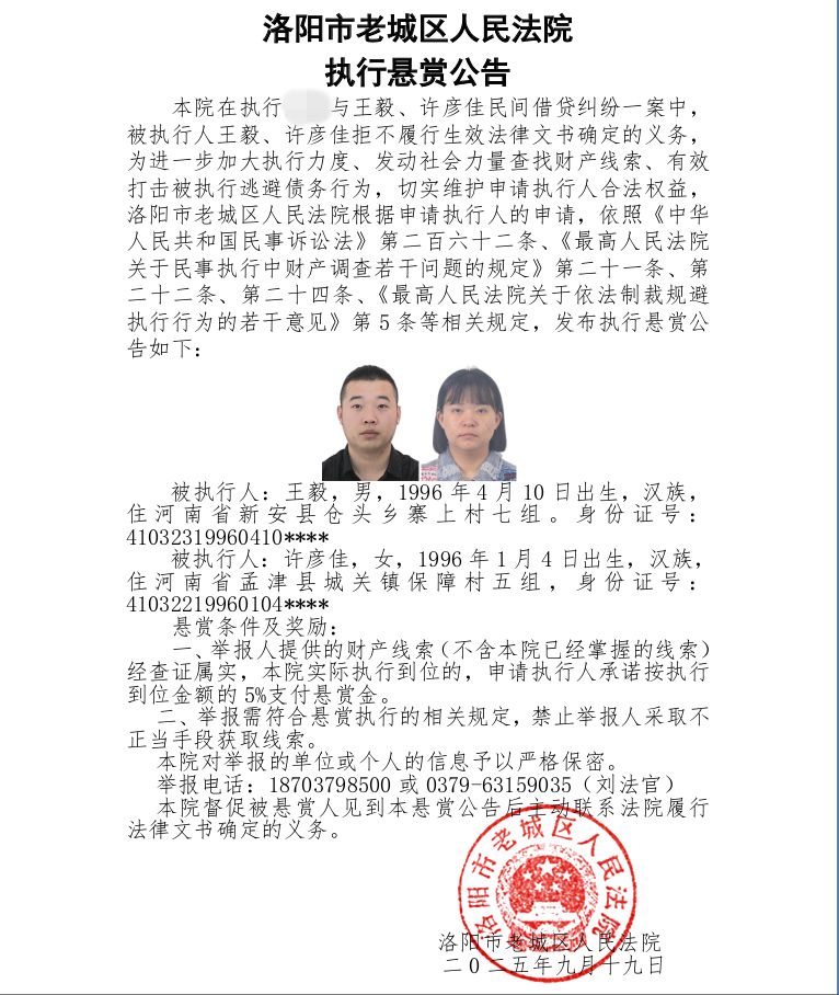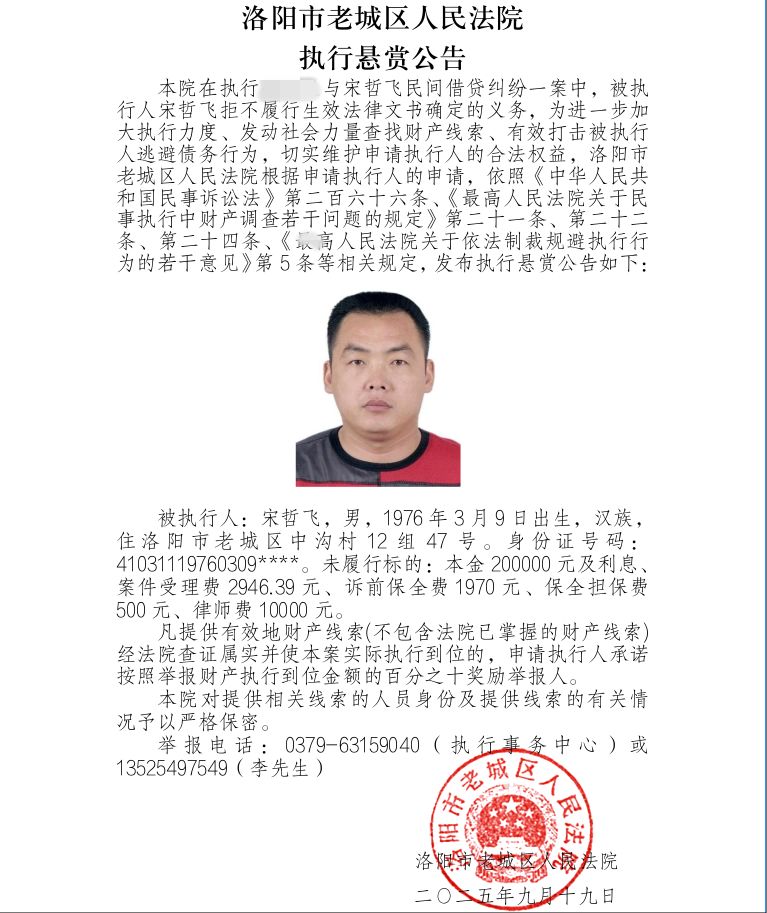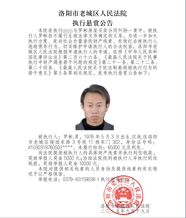 为进一步加大执行力度、发动社会力量查找财产线索、有效打击被执行人逃避债务行为,切实维护申请执行人的合法权益,洛阳市老城区人民法院根据申请执行人的申请,依照《中华人民共和国民事诉讼法》第二百六十二条、《最高人民法院关于民事执行中财产调查若干问题的规定》第二十一条、第二十二条、第二十四条、《最高人民法院关于依法制裁规避执行行为的若干意见》第5条等相关规定,发布执行悬赏公告如下: