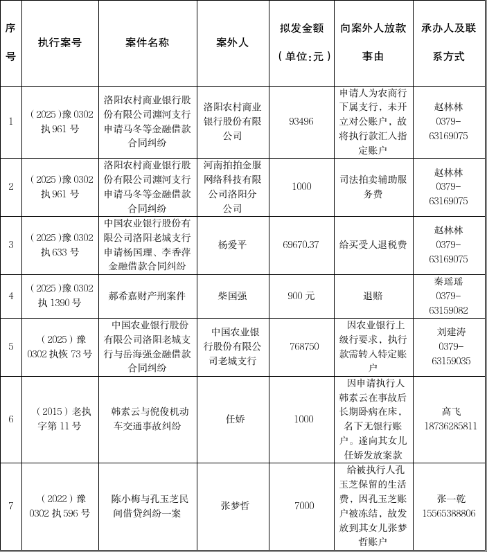 特别提示:公示期满3个自然日后,如无当事人提出异议,则该案款将向案外人发放,监督电话:0379-63159009。
