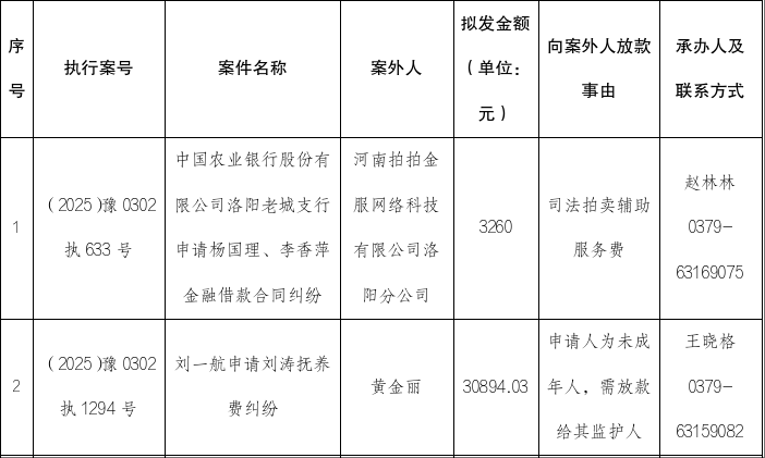 特别提示:公示期满3个自然日后,如无当事人提出异议,则该案款将向案外人发放,监督电话:0379-63159009。