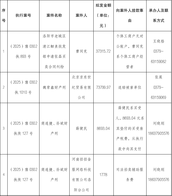 特别提示:公示期满3个自然日后,如无当事人提出异议,则该案款将向案外人发放,监督电话:0379-63159009。