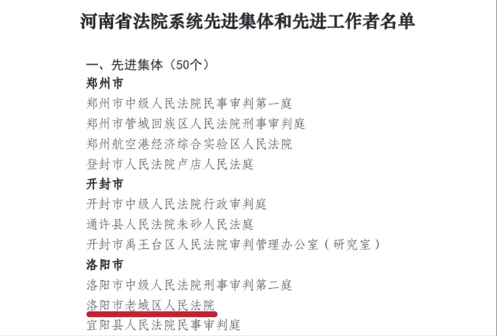 为表彰先进、激励队伍,进一步推动全省法院工作高质量发展,近日,河南省高级人民法院发布了《关于表彰河南省法院系统先进集体和先进工作者的决定》,分别授予50个集体、150名个人“河南省法院系统先进集体”和“河南省法院系统先进工作者”称号。其中,洛阳市老城区人民法院获得表彰。
