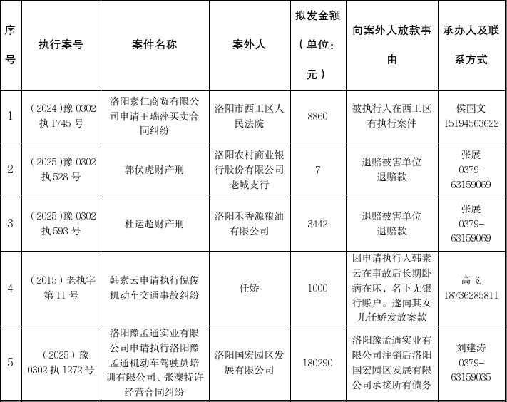 为进一步规范执行案款收发、管理,完善执行案款管理工作,维护当事人合法权益,防患廉政风险,现将洛阳市老城区人民法院拟向案外人发放的金额公示如下:
