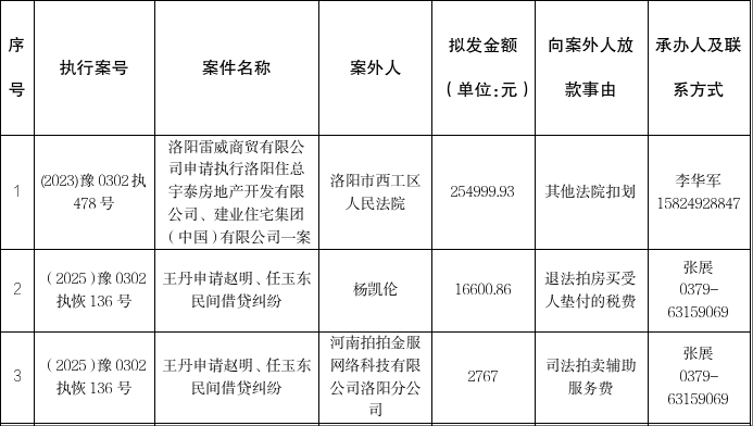 特别提示:公示期满3个自然日后,如无当事人提出异议,则该案款将向案外人发放,监督电话:0379-63159009。