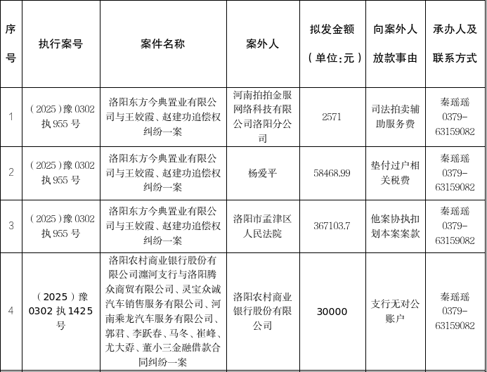 特别提示:公示期满3个自然日后,如无当事人提出异议,则该案款将向案外人发放,监督电话:0379-63159009。