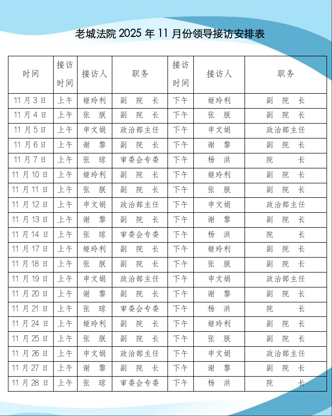 为深入贯彻落实习近平总书记关于加强和改进信访工作的重要思想,认真落实《信访工作条例》,进一步畅通群众信访渠道,依法及时解决群众合理合法诉求,现将老城区法院11月份接访安排公示如下: